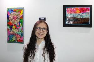 The exhibition featured student artwork including stained glass, yarn panting, acrylic paint markers, watercolor, oil pastels and ebony pencils, noted Stredrick. The collection also included images of TV characters, flowers, fruits, animals angels and family situations, she added.