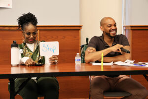 Time keeper Rhonda Witty and moderator Chris Scott facilitate conversation
